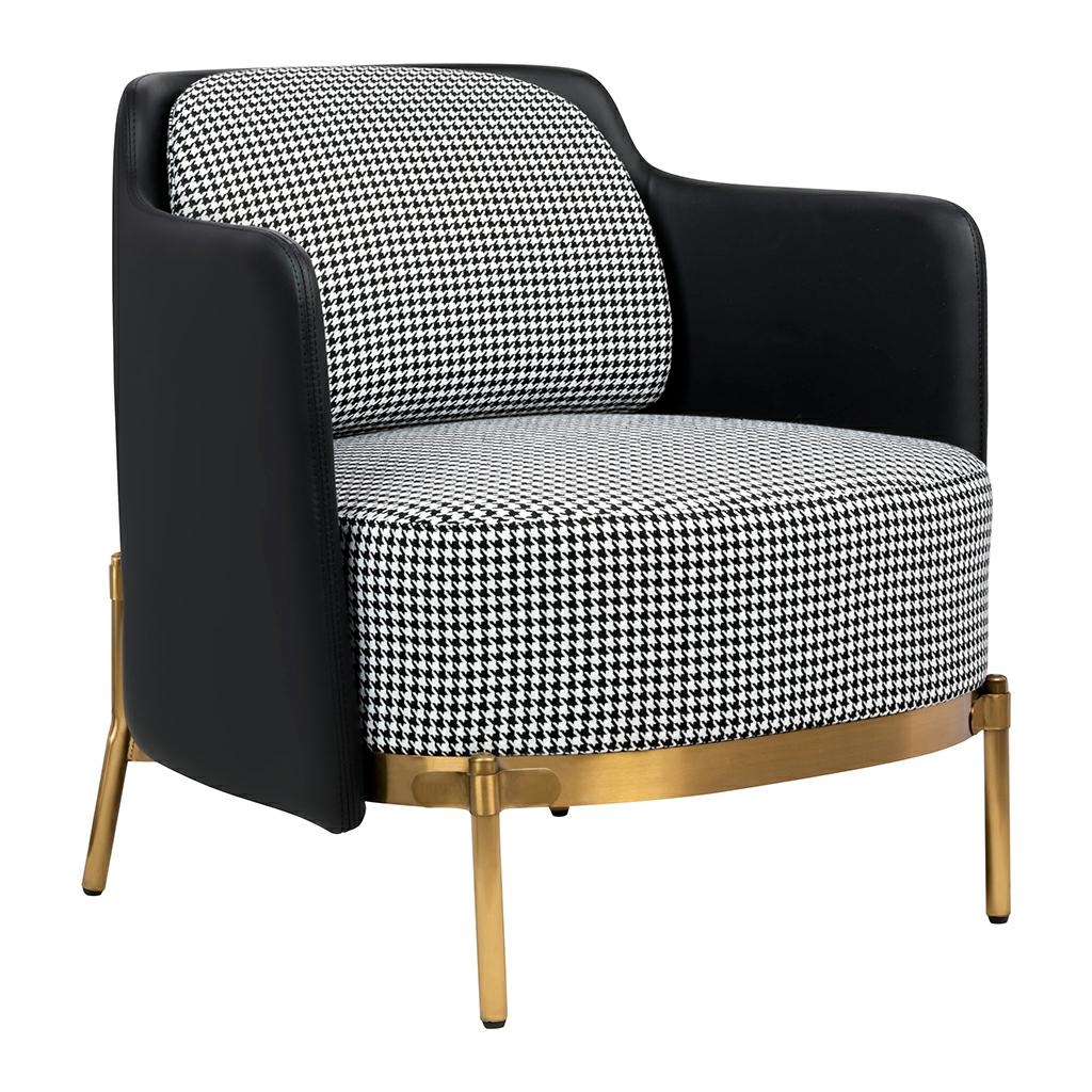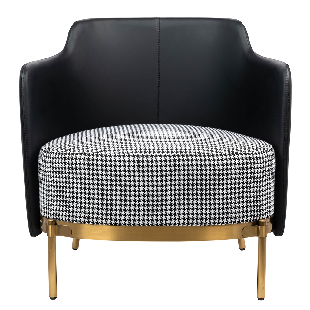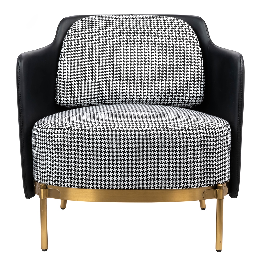 Siedzisko oraz poduszka obszyte jest tkaniną w biało-czarną pepitkę. Tył fotela wraz z podłokietnikami tapicerowany jest ekoskórą w kolorze czarnym.