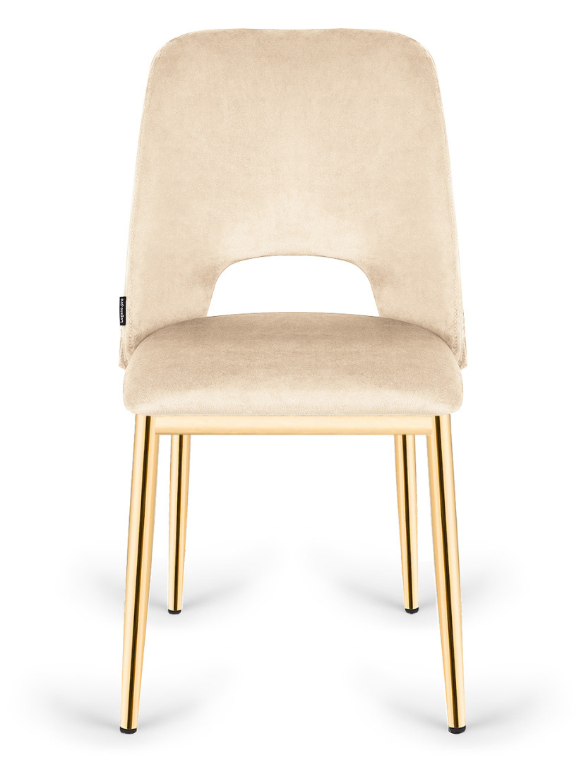 GOTI – Klasyczne krzesło na złotych nogach, tapicerowane welurem w kolorze beżowym.