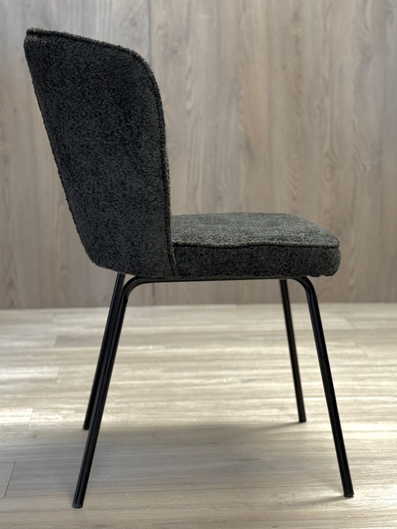 TEDDY BLACK – Nowoczesne krzesło tapicerowane tkaniną typu boucle (efekt owczej wełny) w kolorze czarnym na czarnych metalowych nogach.