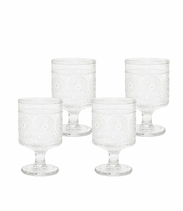 Każda szklanka zachwyca subtelnymi, tłoczonymi wzorami inspirowanymi motywami roślinnymi, które pięknie rozpraszają światło.
